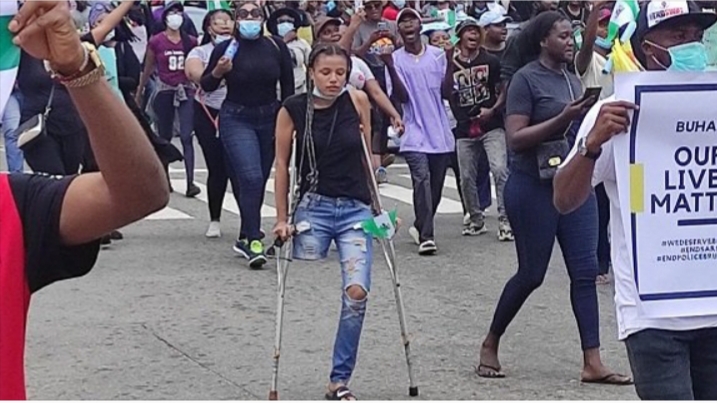 WITHIN NIGERIA learnt that the young lady, Obiene joined the hundreds of Abuja #EndSARS protesters bearing crutches.